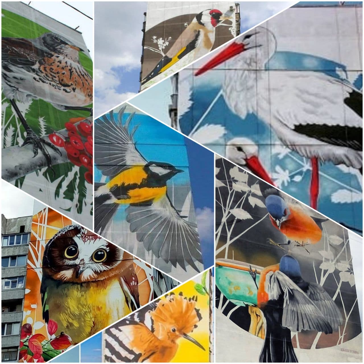 Продолжают список многочисленные муралы различных птиц. Только самых крупных рисунков насчитывается около 8 штук. Это муралы: “Дрозд Рябинник”, “Большая синица”, “Зимородок”, “Щегол”, “Зяблики”, “Аисты”, “Удод” и “Сыч домовой”. Все эти муралы созданы в рамках проекта “Птицы” творческой группы Kailas-V. Цель этого проекта — показать, какие удивительно красивые птицы живут рядом с нами, в нашей местности.
