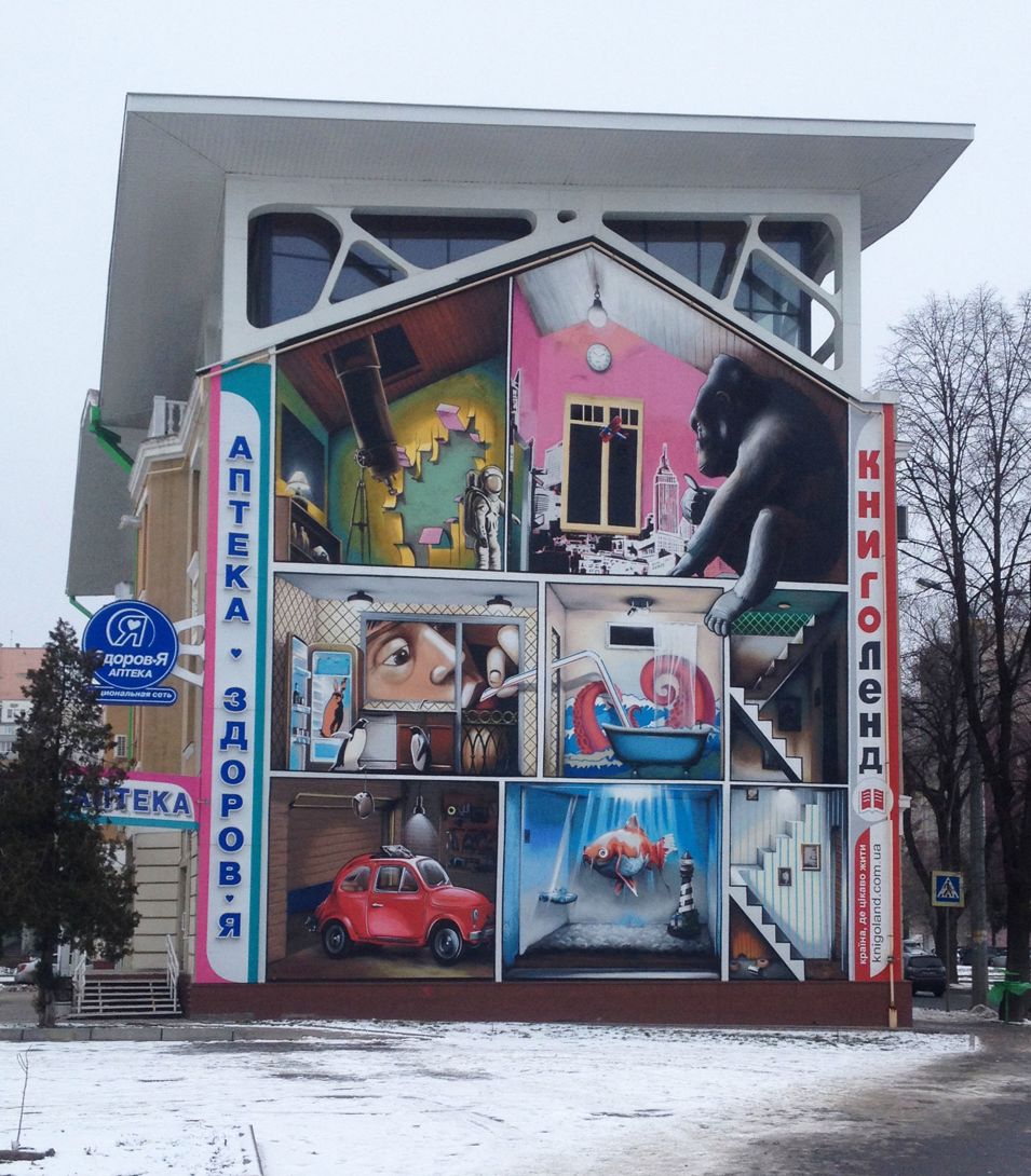 Ещё один известный мурал, который явно выделяется на фоне привычных Харькову портретов находится по адресу: Плехановский переулок,3. Появился рисунок в 2014 году и был приурочен ко Дню города. Авторы проекта сообщили, что работа заняла у художников более месяца. Необычный рисунок заставляет прохожих останавливаться и рассматривать его с интересом, используя свою фантазию и воображение для того, чтобы понять его.