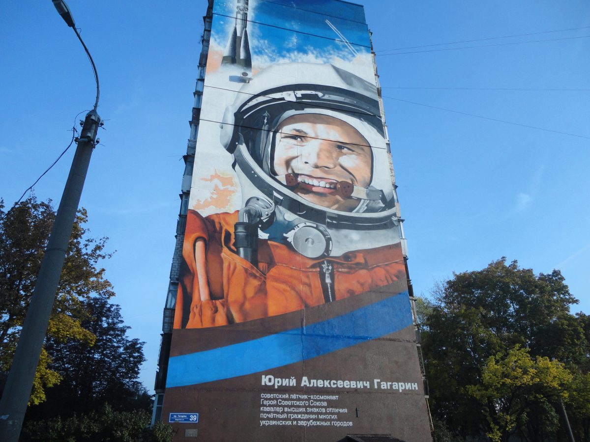 Это не просто красивый рисунок. Мурал носил звание самого большого граффити в Украине. На нём изображен Юрий Гагарин — первый космонавт Земли. Расположен мурал на проспекте, который также назван в честь известного космонавта. Через год титул самого большого мурала по праву достался портрету Т.Г. Шевченко.