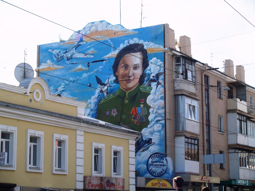 Валентина Гризодубова — знаменитая летчица из Харькова, а также дочь  Степана Васильевича Гризодубова — первого авиатора Харькова. Мурал с её изображением находится по адресу Московский проспект, 28. Она первая из женщин, удостоенных звания Героя Советского Союза.