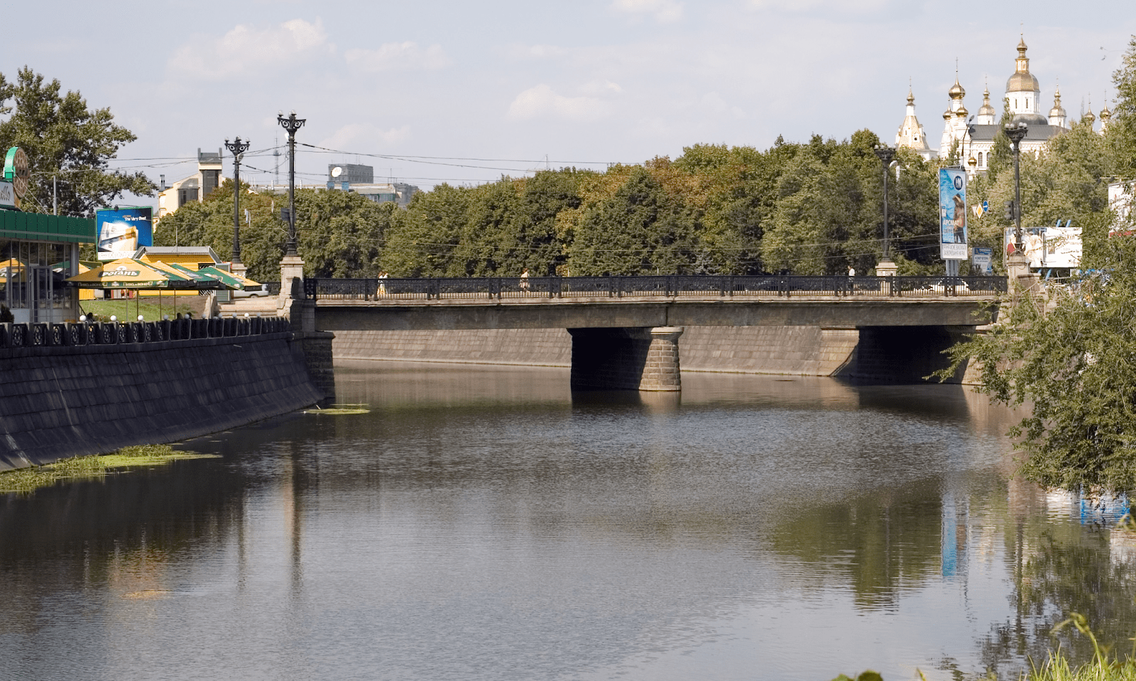 Перший кам’яний міст на цьому місці було збудовано у 1901 році. Сучасний Харківський міст було створено у 1954 році. Гранітні постаменти та декоративні ліхтарі, які входять до архітектурного оформлення мосту, роблять його цікавим не лише з транспортного, а й з архітектурного погляду.