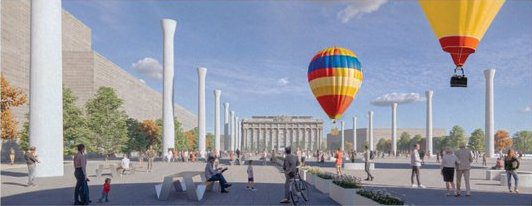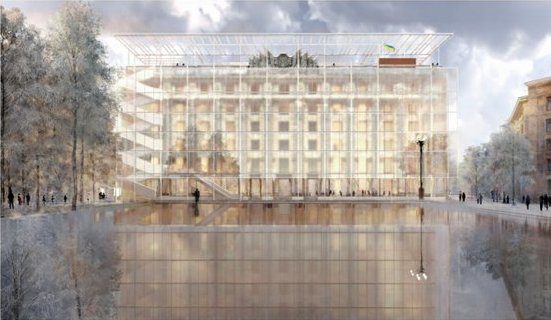 На другому місці — проєкт з Ізраїлю “Вчасно”. Ізраїльські архітектори пропонують закрити дах і фасад будівлі напівпрозорим склом. На площі перед будівлею має розміщуватися великий басейн на довжину всього майдану.
