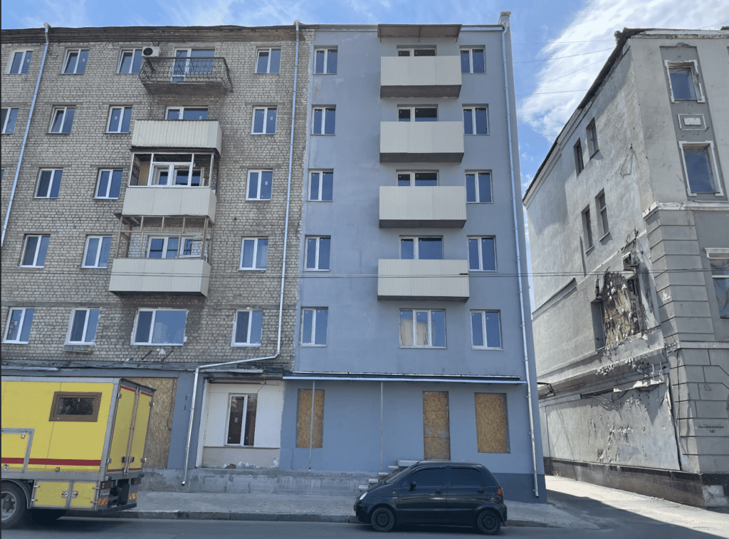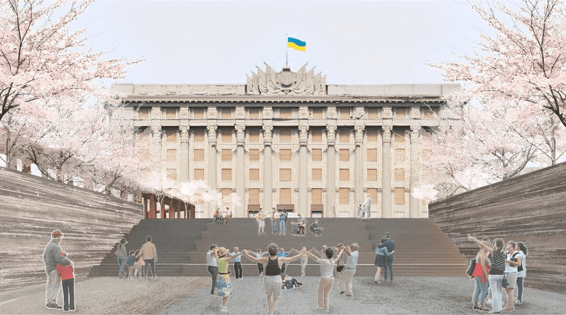 Перше місце посів проєкт архітекторів з Великої Британії під назвою “Зцілення Харкова: від руїн до відродження”. Архітектори запропонували відновити будинки за допомогою матеріалів вторинного перероблення, суттєво змінити зовнішній вигляд фасадів на більш сучасний, а також зробити багато зелених зон довкола споруд.