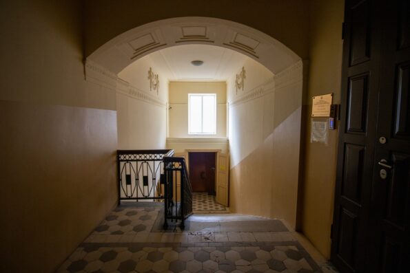 У підвальних приміщеннях будинку розташовувався театр-кабаре “Будинок артиста”, який було відкрито восени 1918 року. Приміщення театру оформляли художники групи “Сім” – Володимир Бобринський, Георгій Цапок та Борис Косарєв. Бобрицький розписав зал, зобразивши персонажів “Комедії дель арте”: П’єро, Арлекіна та Коломбіну. Цапок оформив бар, а Косарєв створив оригінальні світильники з матового скла, які створювали камерну та затишну атмосферу. Зал театру вміщував близько 300 осіб. Програма “Будинку артиста” змінювалася щотижня, пропонуючи глядачам різноманітні вистави. Особливо популярні були харківські огляди Олександра Д’Актиля, які викликали бурхливе захоплення публіки. Головні ролі у виставах виконували артисти Данильський та Ратов. Олександр Вертинський у своїх спогадах описував “Будинок артиста” як “веселе та галасливе місце, куди після вистав збиралися актори з усіх театрів міста. Тут завжди панувала атмосфера творчості та імпровізації”. Театр об’єднував представників різних творчих професій – акторів, музикантів, письменників та поетів – і з часом став важливим культурним центром Харкова.